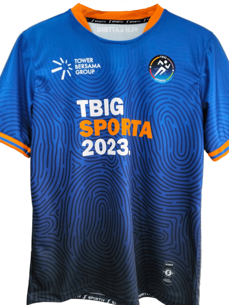 Jersey badminton TBIG tampil dengan dominasi warna biru corporate yang mencerminkan profesionalisme, stabilitas, dan kepercayaan—nilai yang sejalan dengan identitas PT Tower Bersama Infrastructure Tbk. Logo Tower Bersama Group dan identitas event TBIG Sporta 2023 ditampilkan secara jelas namun tetap elegan, menjadikan jersey ini bukan sekadar pakaian olahraga, tetapi juga simbol kebanggaan karyawan terhadap perusahaan.